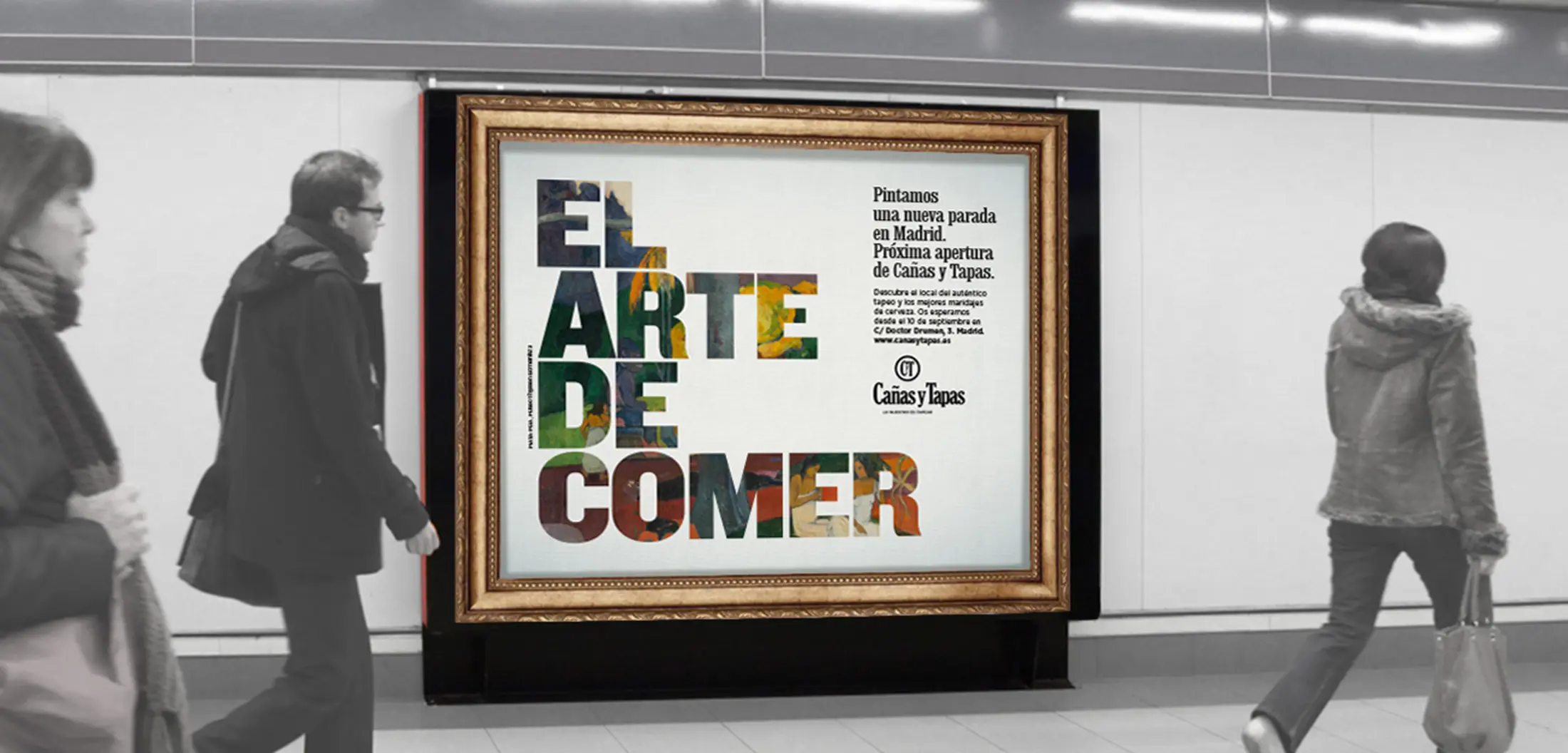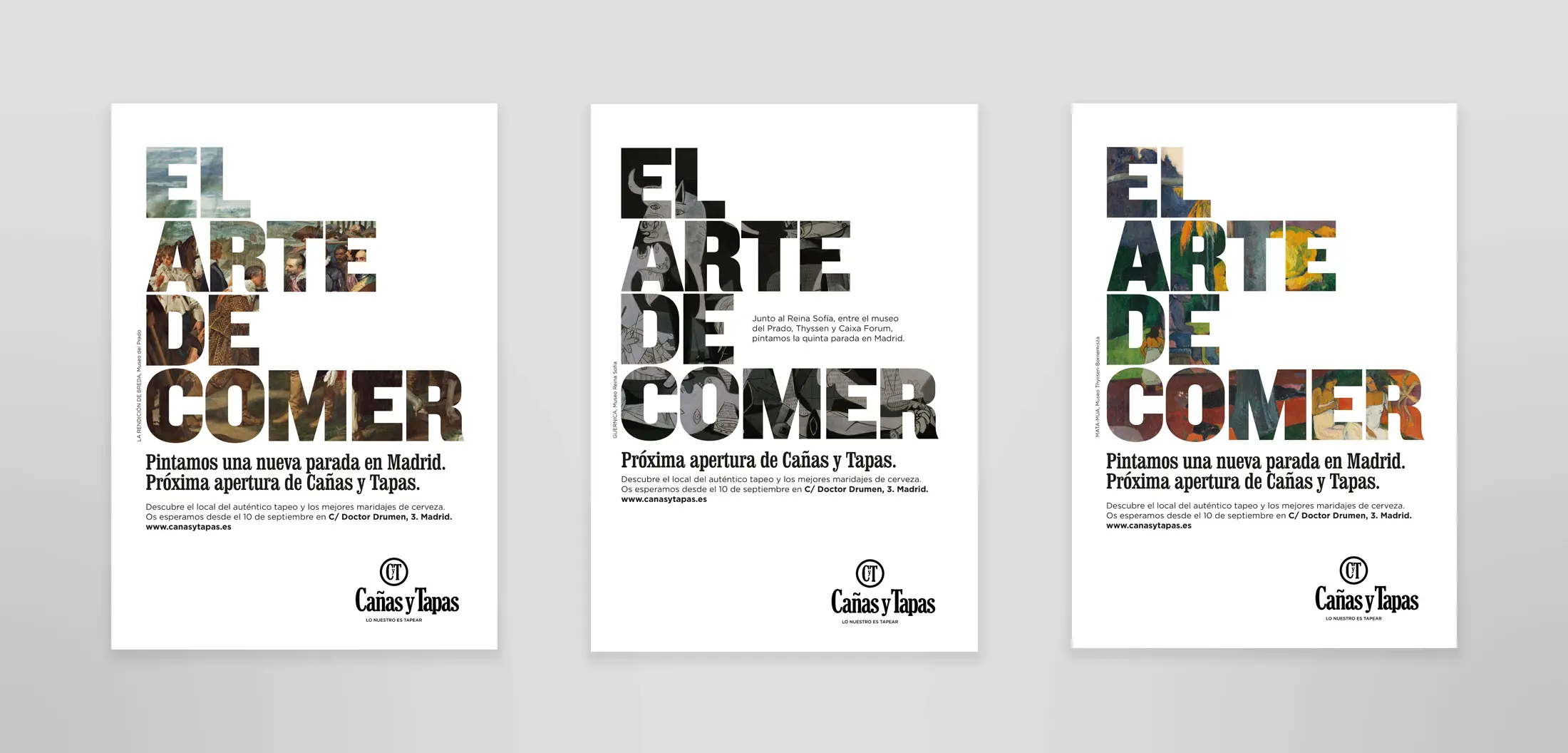 A la hora de plantear el concurso teníamos claro que la ubicación del nuevo local (C/Doctor Drumen) entre el museo del Prado, Thsyssen y Reina Sofía era el punto fuerte. Así que decidimos vincular el arte con la comida generando una campaña rotunda en el mensaje y muy visual. Bajo el concepto “el arte de comer” presentamos una campaña tipográfica donde las letras estaban pintadas por cuadros emblemáticos de los tres museos. Nuestros objetivos eran: vincular de una forma original el arte con Cañas y Tapas, generar vínculos entre el nuevo local y los museos emblemáticos y posicionar al restaurante como un lugar de visita imprescindible. La planificación en medios también formaba parte del concurso, así que planteamos diferentes soportes publicitarios vs. target.