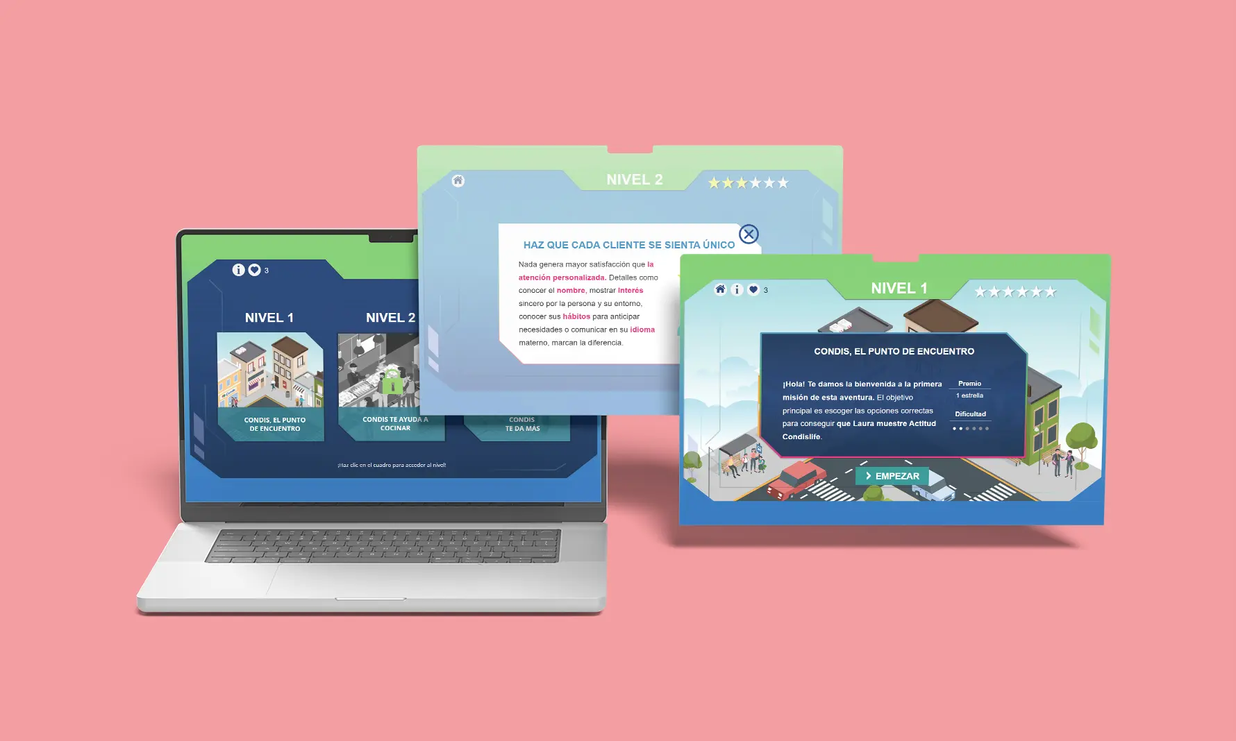 En cuanto a los contenidos del plan de acogida, se han desarrollado píldoras formativas para dar la bienvenida a los trabajadores y trabajadoras de la entidad, mostrarles qué se espera de ellos y ellas, y también los beneficios y ventajas que pueden obtener al completar la formación. Como elemento más distintivo, se ha desarrollado una aventura interactiva, que consiste en un conjunto de personajes del supermercado CONDIS que se encuentran ante situaciones ordinarias a las que deben de dar solución. La persona debe guiar al equipo CONDIS a encontrar la normativa que necesitan para cada caso y, aplicando los principios y normativas institucionales, resolver los distintos dilemas planteados. Por otro lado, se ha creado también un trivial para poder evaluar qué han aprendido los trabajadores/as, así como dos vídeos: uno sobre la historia de la compañía y otro dirigido a motivar a las personas que van a realizar el curso.