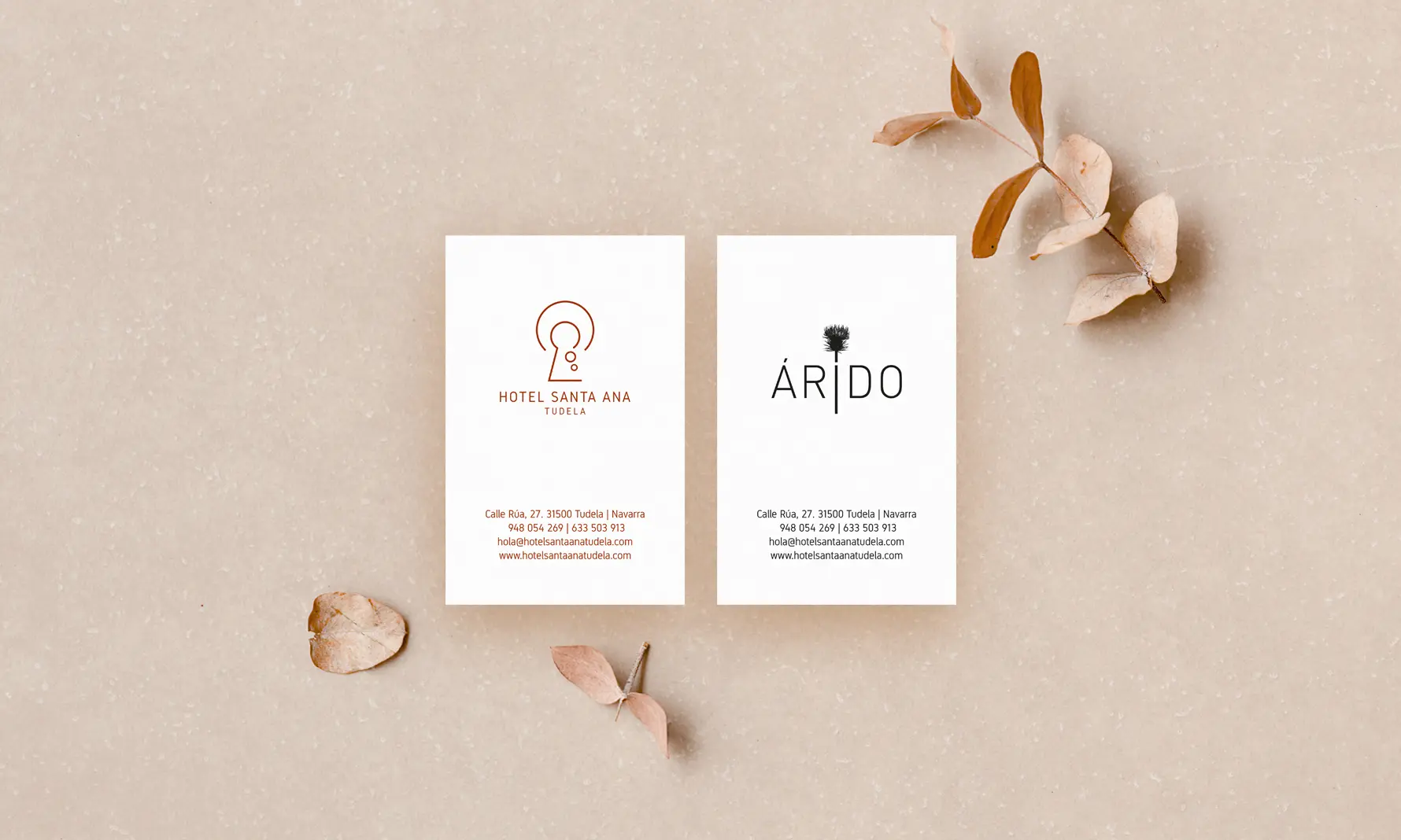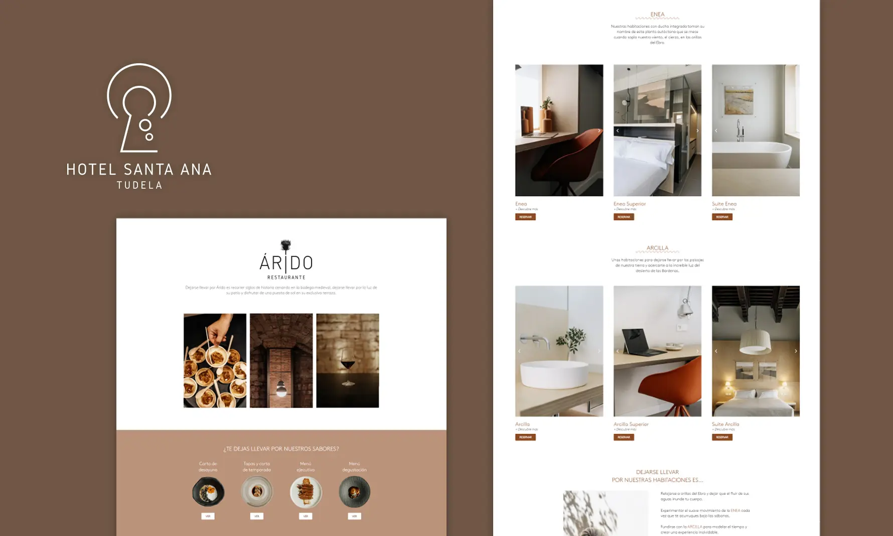Adéntrate en su esencia a través del logotipo que creamos, de forma muy minimalista, representando a Santa Ana y simulando la cerradura de una habitación.Merece la pena mecerse por el Cierzo, acurrucarse bajo la Enea, fundirse con la Arcilla y descubrir La Mejana en su restaurante Árido.